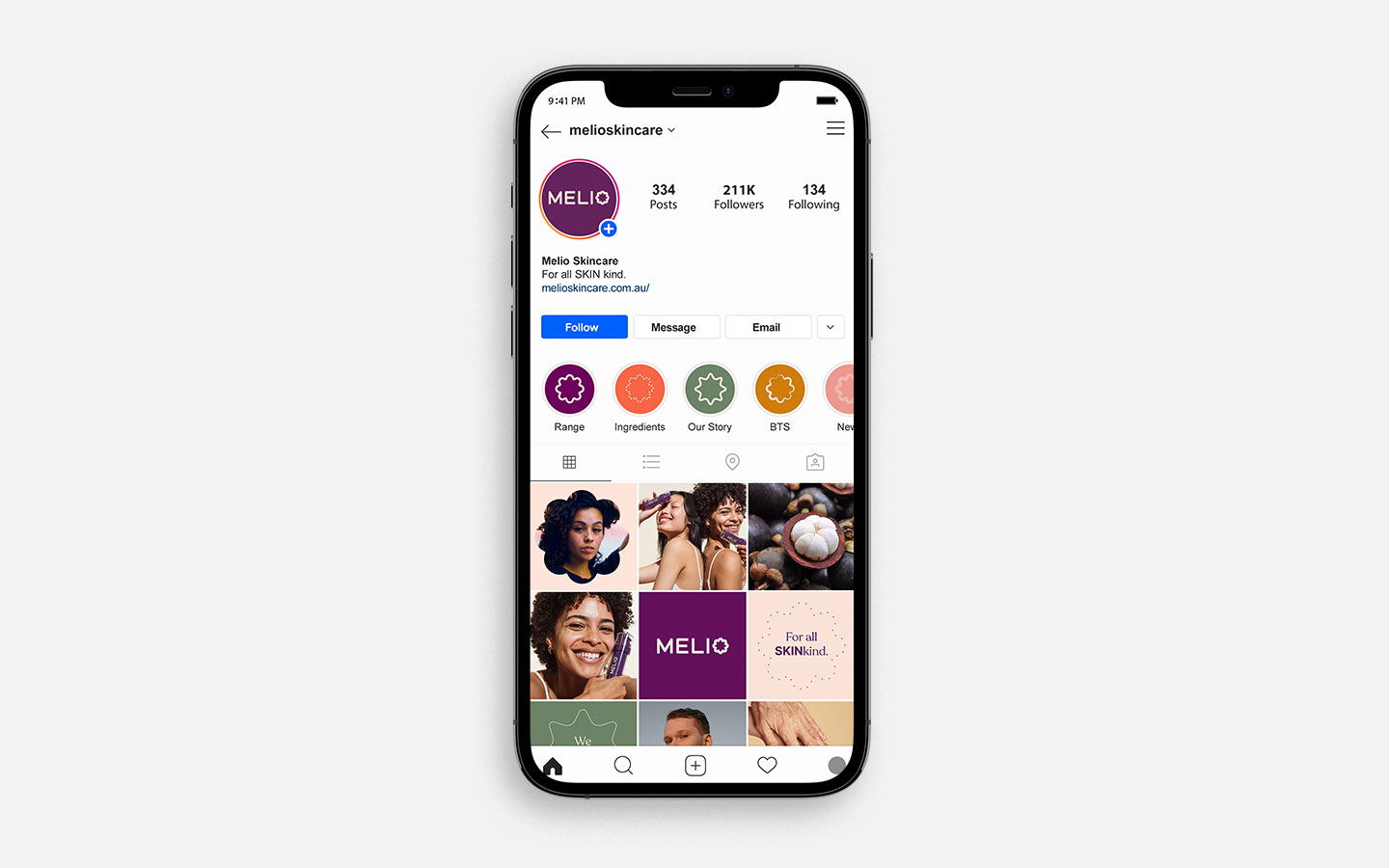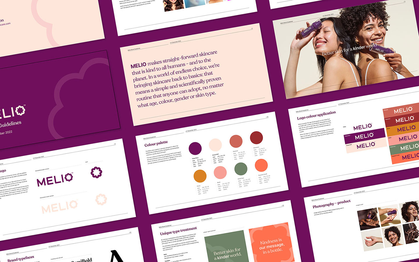 The brand's objective was to embody kindness in every aspect of their brand, from sustainable packaging to inclusive model casting and plant-based ingredients. The brand name "Melio" comes from "meliorism", meaning the belief in making the world better, which perfectly reflects the brand's values. The visual execution of the brand aimed to communicate its Australian roots, stand out in a crowded market, and be gender-neutral. A dark purple hero color was chosen to align with the hero ingredient mangosteen fruit, while an earthy 'Australiana' palette reflected the rainbow bark of eucalyptus. The brand's wordmark was designed to be simple yet warm and textured, with a flourished 'o' reflecting the bisection of a mangosteen. The tagline "Better skin for a kinder world" solidified the brand identity. Melio's sustainable and refillable packaging, gift-boxes, branded social media artwork, and brand collateral such as eDMs and printed promotional materials rounded out the brand design and copy.