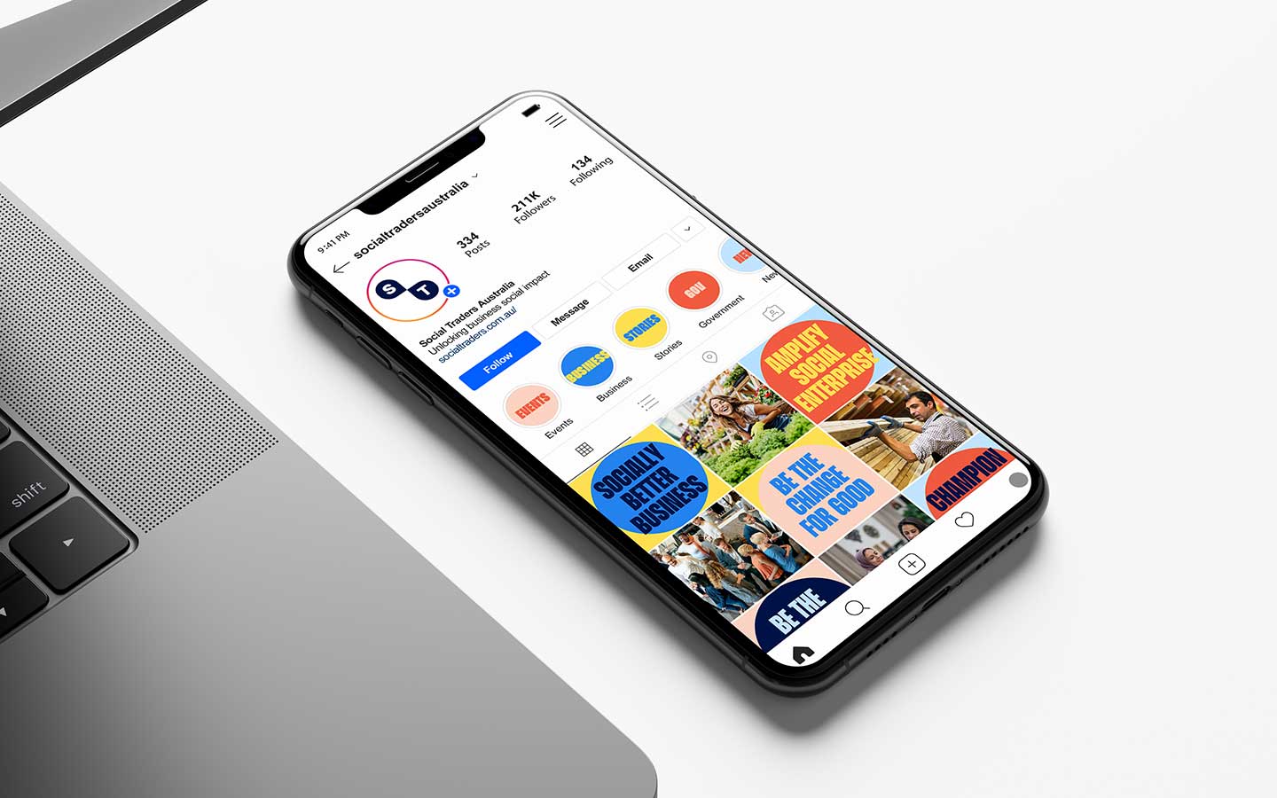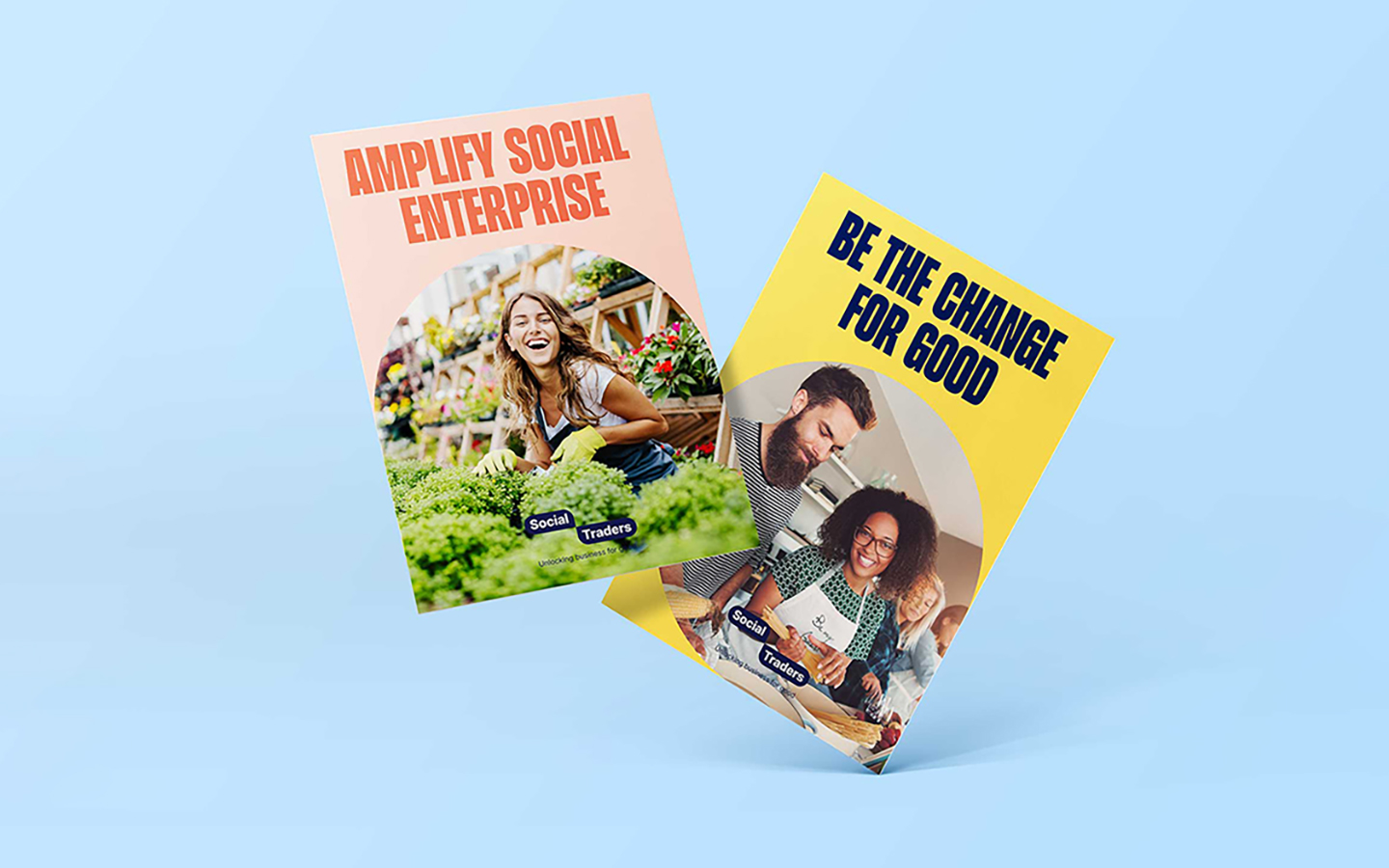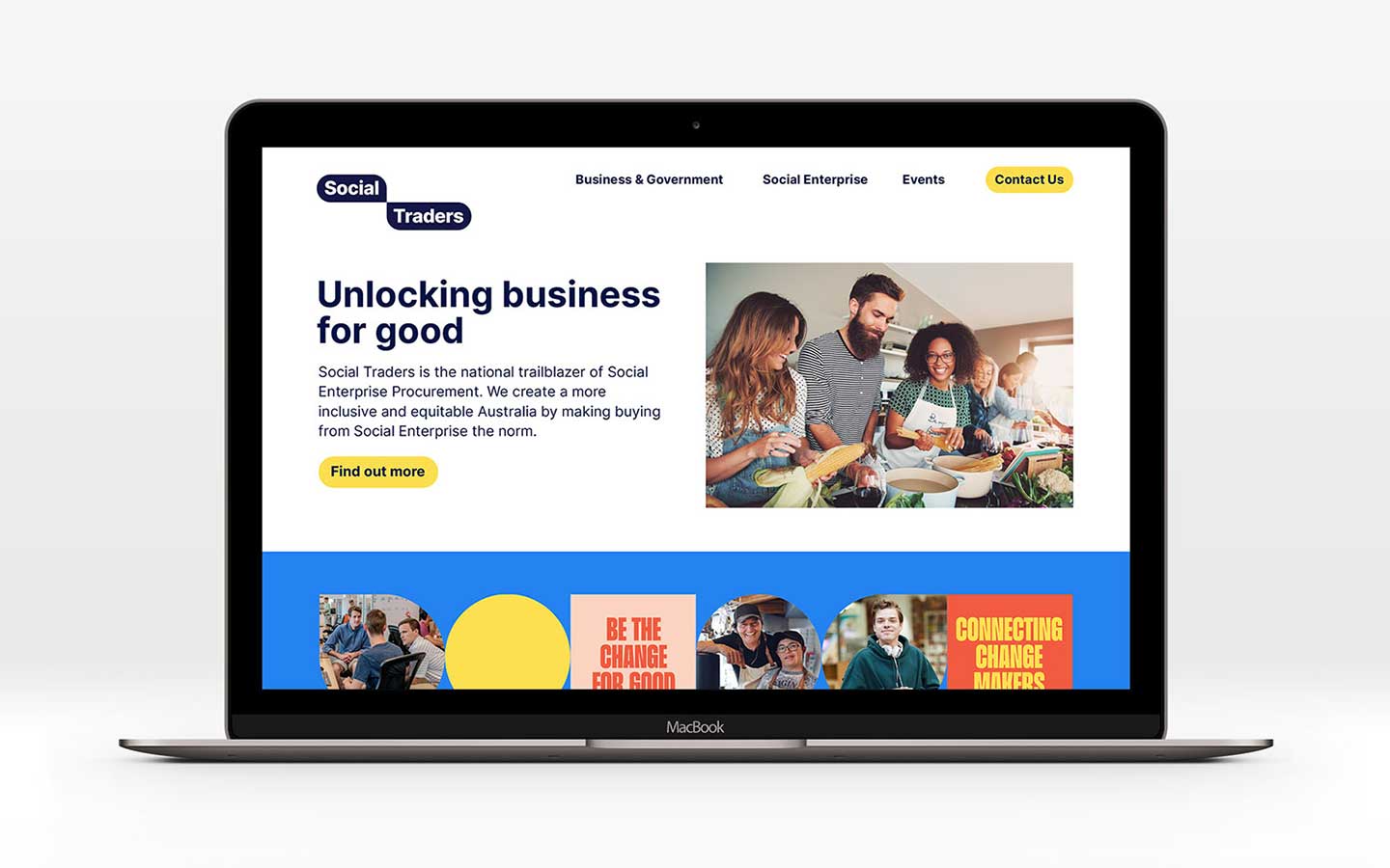 Social Trader’s new brand identity was crafted to bring the energy and pioneering spirit within the organisation to the world and showcase their brand in a confident bold and adaptable way. The new brandmark joins at the corners to represent Social Traders’ unique position as a connector between business, social enterprise, and government. The rounded corners not only create a more friendly looking brand but also create speech bubbles to represent conversation and human interactions.